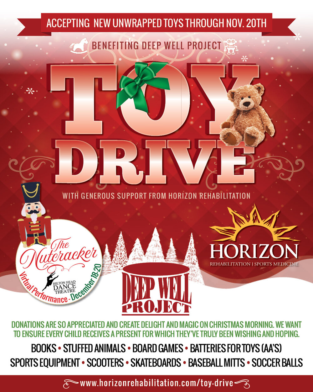 We need your support now through November 20, 2020 for this year’s Toy Drive for Deep Well Project, Hilton Head Island. Your donations are so appreciated and create delight and magic on Christmas morning. We want to ensure every child receives a present for which they’ve truly been wishing and hoping. Our sincerest thanks!